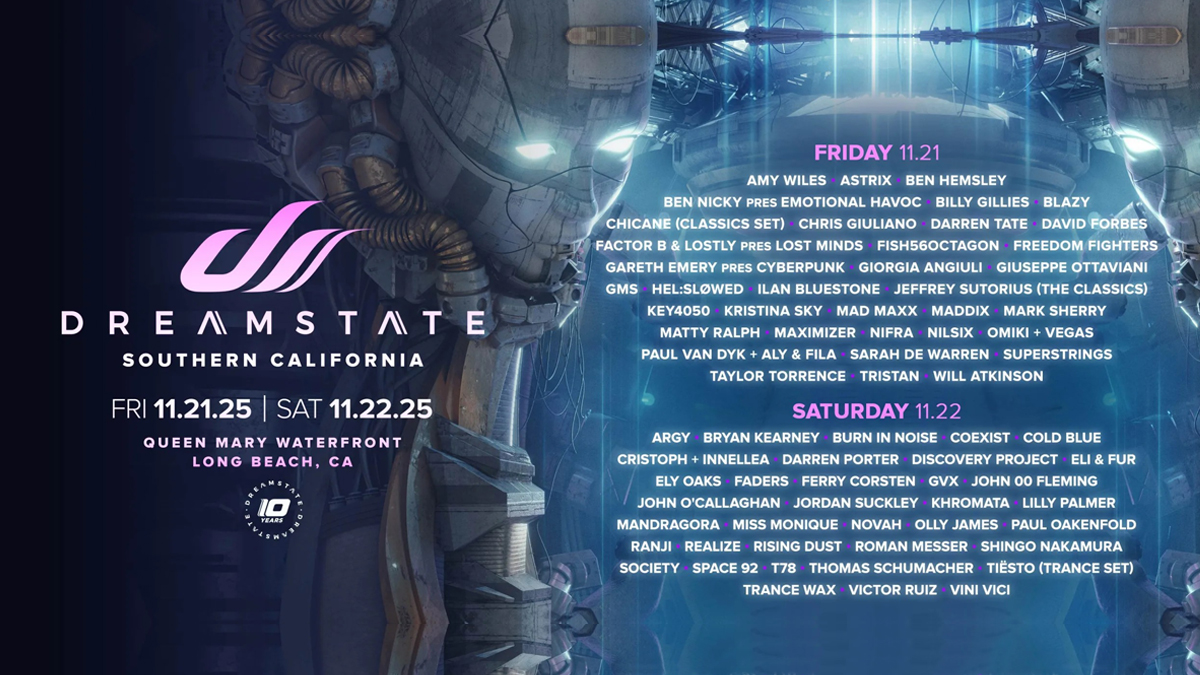 The world’s premier trance festival returns as Dreamstate Southern California celebrates its 10-year anniversary on November 21–22, 2025, at the stunning Queen Mary Waterfront in Long Beach, CA. This year’s edition promises an unforgettable journey through sound, light, and emotion—where euphoric melodies and pulsating beats meet under the stars.